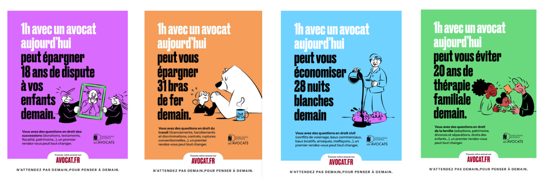 Pour illustrer l'importance de l'avocat, la campagne se décline autour de quatre grands domaines du droit qui concernent toutes les générations :