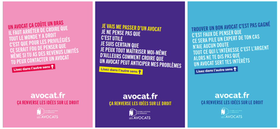 Le Conseil national des barreaux a décidé de regarder les idées reçues en face et de les renverser avec humour. Accessible et ludique, la campagne de communication prend le contrepied des a priori, en offrant aux lecteurs la possibilité de renverser son sens de lecture, de poser un nouveau regard sur la profession d'avocat loin des préjugés. Ainsi, les verbatims dans les visuels qui paraissent négatifs aux premiers abords, deviennent positifs lorsqu'on change le sens de la lecture.